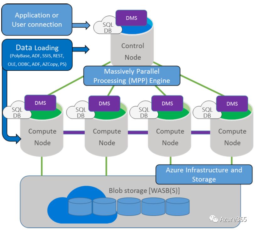 简单来看,在一个标准的Azure数据仓储结构中,有一个SQL控制节点用来连接应用和用户端,同时配有大型并发计算引擎自动平衡后端DMS计算节点的任务分配,前后端的调用方式包括SQL集成服务(SSIS),REST API,ODBC等等。底层blob存储提供了高性价比高密度的大数据存储资源。