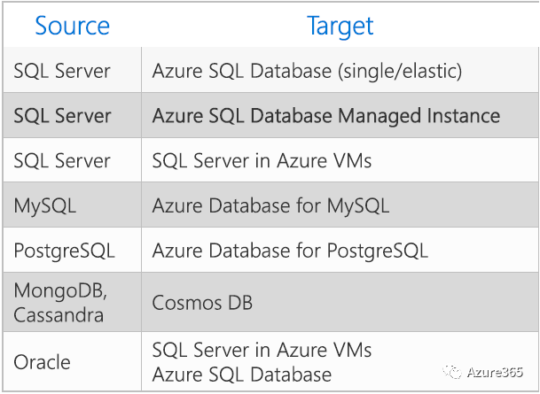 借助Azure数据库迁移服务,可以加速数据上云,减小云迁移的复杂程度,因为它是一个端到端的解决方案并且提供引导式流程(Wizard),更快速地完成所需操作,甚至无需用户具备专业技能即可获得可靠结果。以下是本地原生数据库到Azure目标数据库的对应关系。