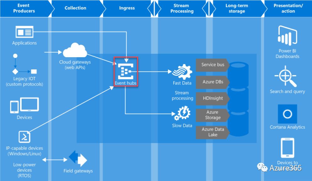 在对接如此多的数据源后,面对这些原始事件,普通的流管道是有超时时间的,同时在不确定OLAP和OLTP需求之前,也无法轻易地直接将其转存到任何一个持久化场所。这里就需要一个事件中心(Event Hub)来充当大数据的入口。