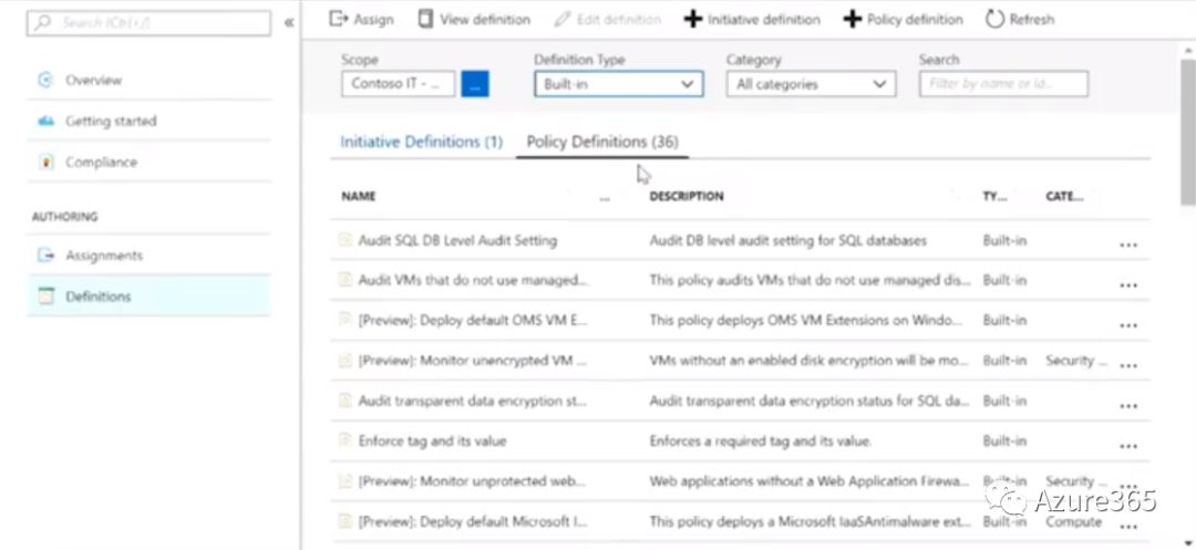 Azure上默认有36个预定义的策略,从VM创建、数据库访问、防火墙穿越的审计,到各类API、资源的调用监控,基本上涵盖了日常IT运维的需要。