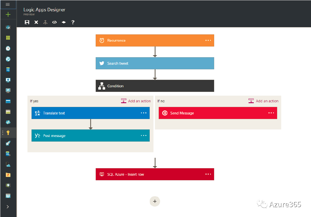 在企业内外部都有很多API供我们有偿或无偿地调用,只要厘清业务逻辑,我们就能开发出新的应用,这类由API集成的应用也被称为逻辑应用,它提供了用于在云端简化并实现可缩放的集成工作流的方式。Azure针对这类应用提供了可视化设计器,用于为流程建模并将流程作为一系列步骤(即工作流)自动执行。云端和本地有多个连接器可跨服务和协议快速集成。逻辑应用通常以触发器开头(例如,“当将账户添加到Dynamics365时”),再出发之后许多组合操作、转换和条件逻辑才能开始。