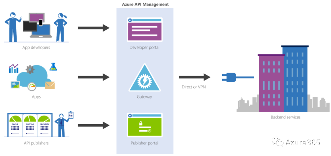 Azure的API管理可以帮助组织将API发布给外部、合作伙伴和内部开发人员,以充分发挥其数据和服务的潜力。API管理提供了核心能力,通过开发人员参与、商业洞察力、分析、安全和保护确保成功的API程序。它由三部分工具组成。