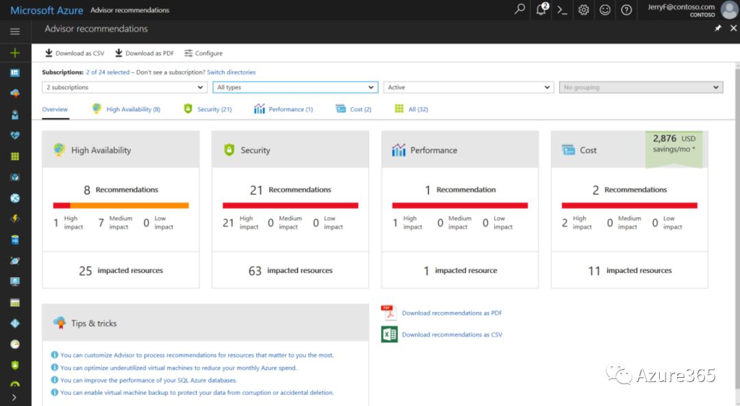 核心监控模块中的Azure顾问服务可帮助用户遵循最佳做法来优化Azure部署,分析资源配置和遥测使用情况并推荐解决方案,有助于提高Azure资源的经济效益、性能、高可用性和安全性。并且这项功能已在Azure China开始预览。