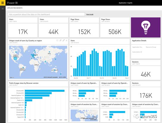 App Insights的输出也可以有多种形式,除了直接作为报警提醒运维人员外,更可以与DevOps流程集成,作为与各种开发工具交互的连接点,并提供实时运维数据支持,例如下面的Power BI。