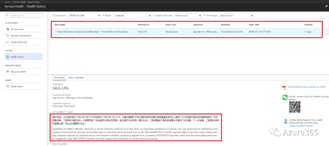 在上图中我们不仅看到了事件发生的事件和描述,还有建议的处理方案,右边还可以下载具体事件报告,国内版还有公众号支持直接联系官方(当然是世纪互联啦)支持人员。小编也是多年的资深运维人员,必须说,这个界面是我所见过的最友好的运维面板。告诉你问题,提供你解决办法,还有后续跟进,简直是把运维人员当成傻子。