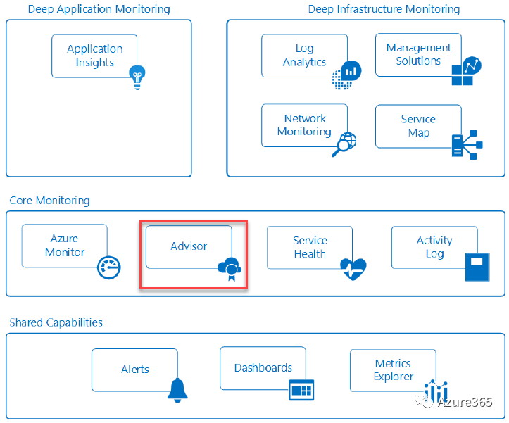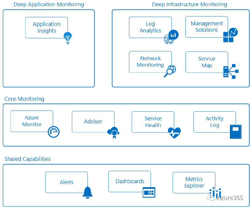 我们来看下Azure监控的全景图,包括了核心监控、深度应用监控、深度基础架构监控以及与其他Azure服务共享的组件。