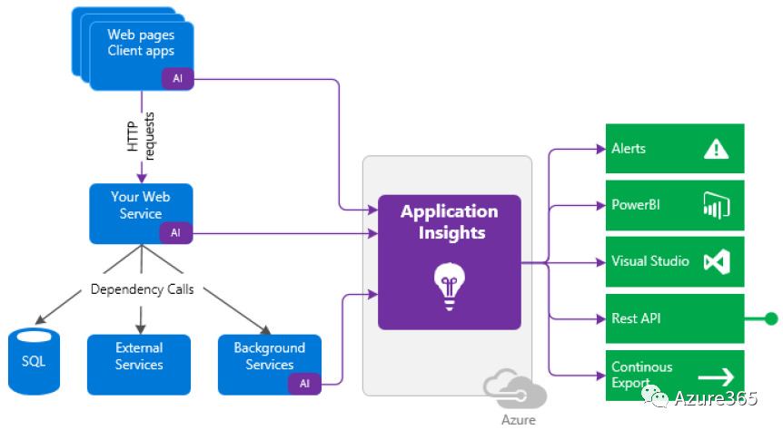 从上图中可以看到在web应用的前中后端都有App Insights的代理客户端,也就可以垂直监测到一个web应用各个组件的性能异常,不光如此,App Insights的服务端还包含了强大的分析来帮助诊断问题,了解用户在应用中实际执行了哪些操作,以帮助提高性能和可用性。它适用于本地或云托管平台(包括.NET、Node.js和J2EE)中的应用。