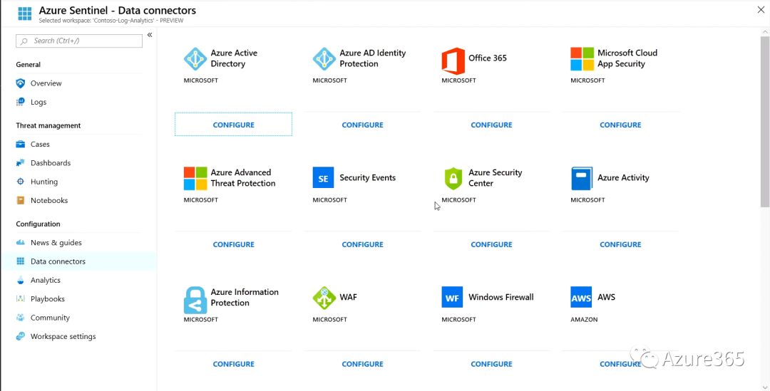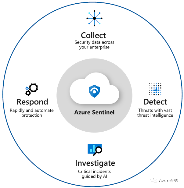 从上图可以看到Azure Sentinel从事件收集、检测、调查、响应提供了一站式的最佳实践解决方案,并且借助ExpressRoute可提供理论上无限的云速度和规模,通过内置AI功能提供更快的威胁防护功能,借助预定义的连接器可以连接到各种Azure或第三方资源。